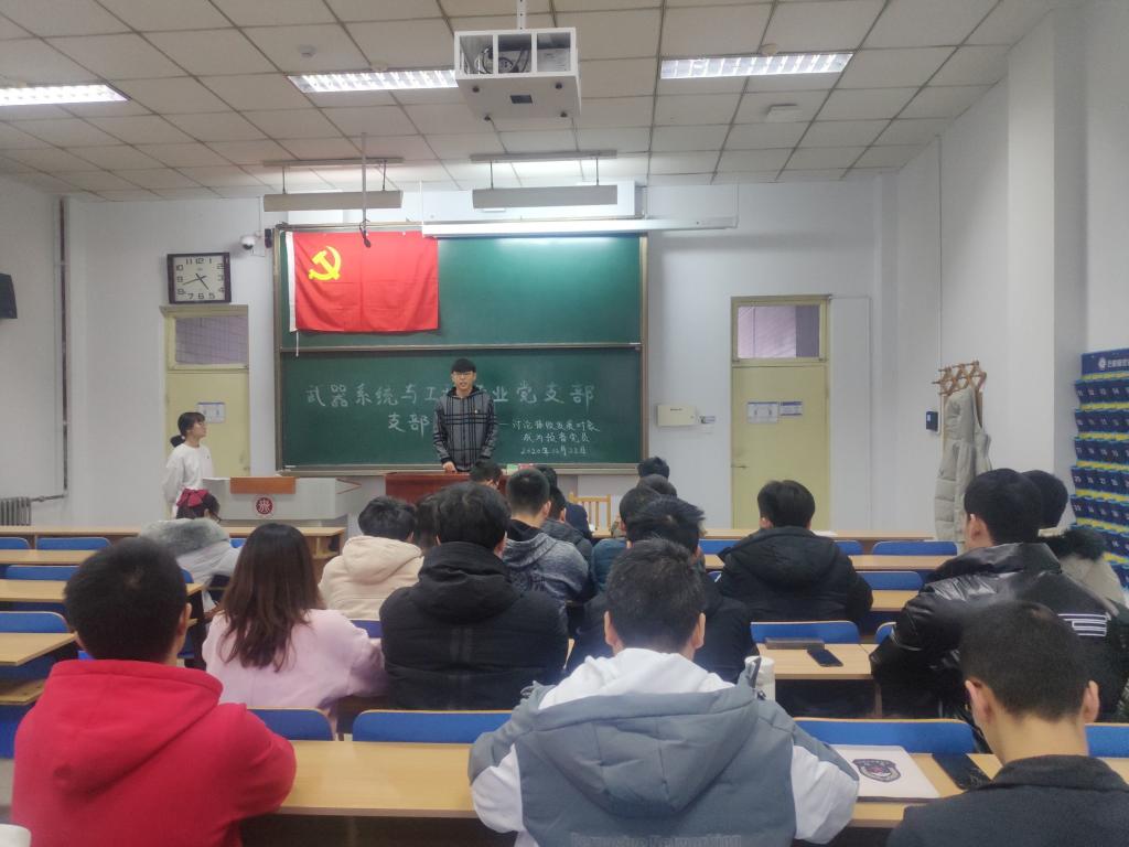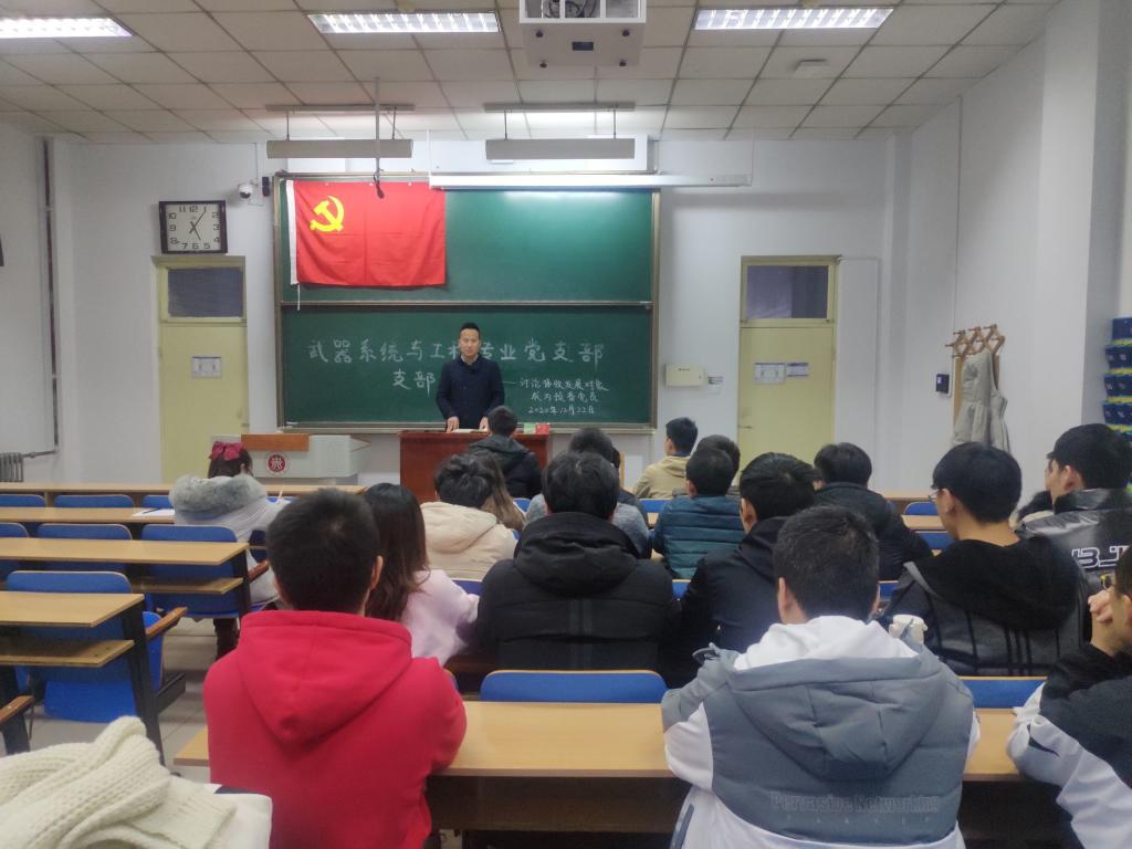 武器系统与工程专业党支部在11207H成功举办了讨论接收发展对象成为预备党员大会。大会由支部组织委员杨洋同志主持,参加此次大会的有武器系统与工程专业党支部的支部书记刘光老师,全体学生党员和预备党员,及3名即将成为预备党员的发展对象。