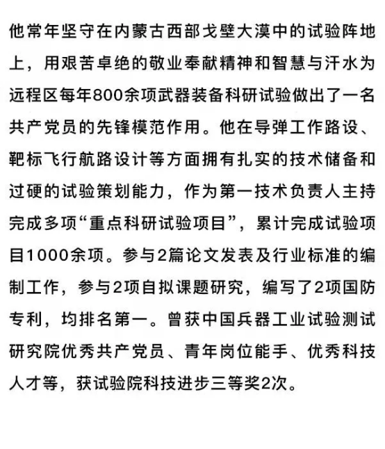 2008级武器系统与发射工程专业学生,他从2012年大学毕业后到远程试验区工作的8年时间里,刻苦学习业务知识,不断提高技术水平,注重团队建设,肯于带头实干,用智慧与汗水为武器装备科研试验作出了重要贡献。