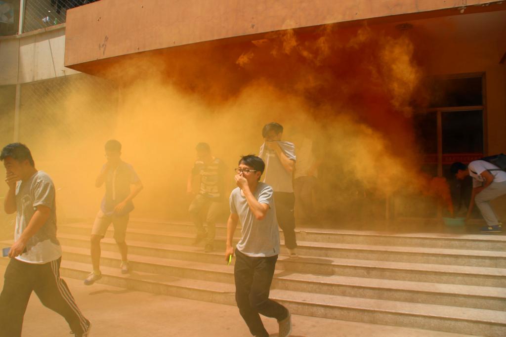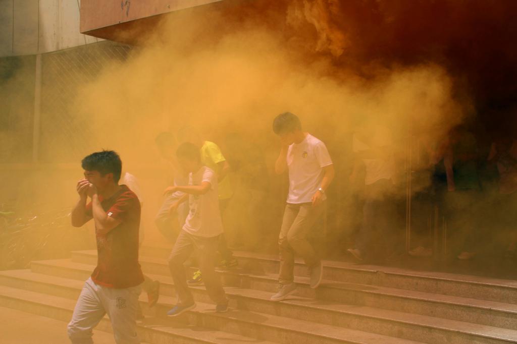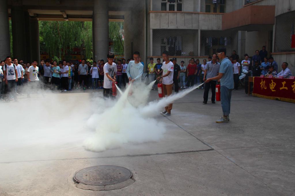 下午1点20分,随着一声哨响,在各个寝室楼的门口处纷纷冒出了滚滚浓烟,演习也宣布正式开始。在听到哨声后,同学们有条不紊的用湿毛巾或者手帕捂住口鼻俯身从寝室楼中撤离出来。撤离过程中,并没有发生十分拥挤的现象,整个过程显得井井有条。很快同学们都从寝室撤离出来,来到了楼下的广场集合。院党委副书记刘光老师为本次消防演习致辞。随后保卫处史科长向同学们讲解了消防应急措施,并在现场为我们展示。之后校医院的白医生为大家讲解了一些急救方法,使同学们掌握紧急情况中的急救方法。接下来,同学们在专业的指导下学会了用灭火器进行灭火操作。