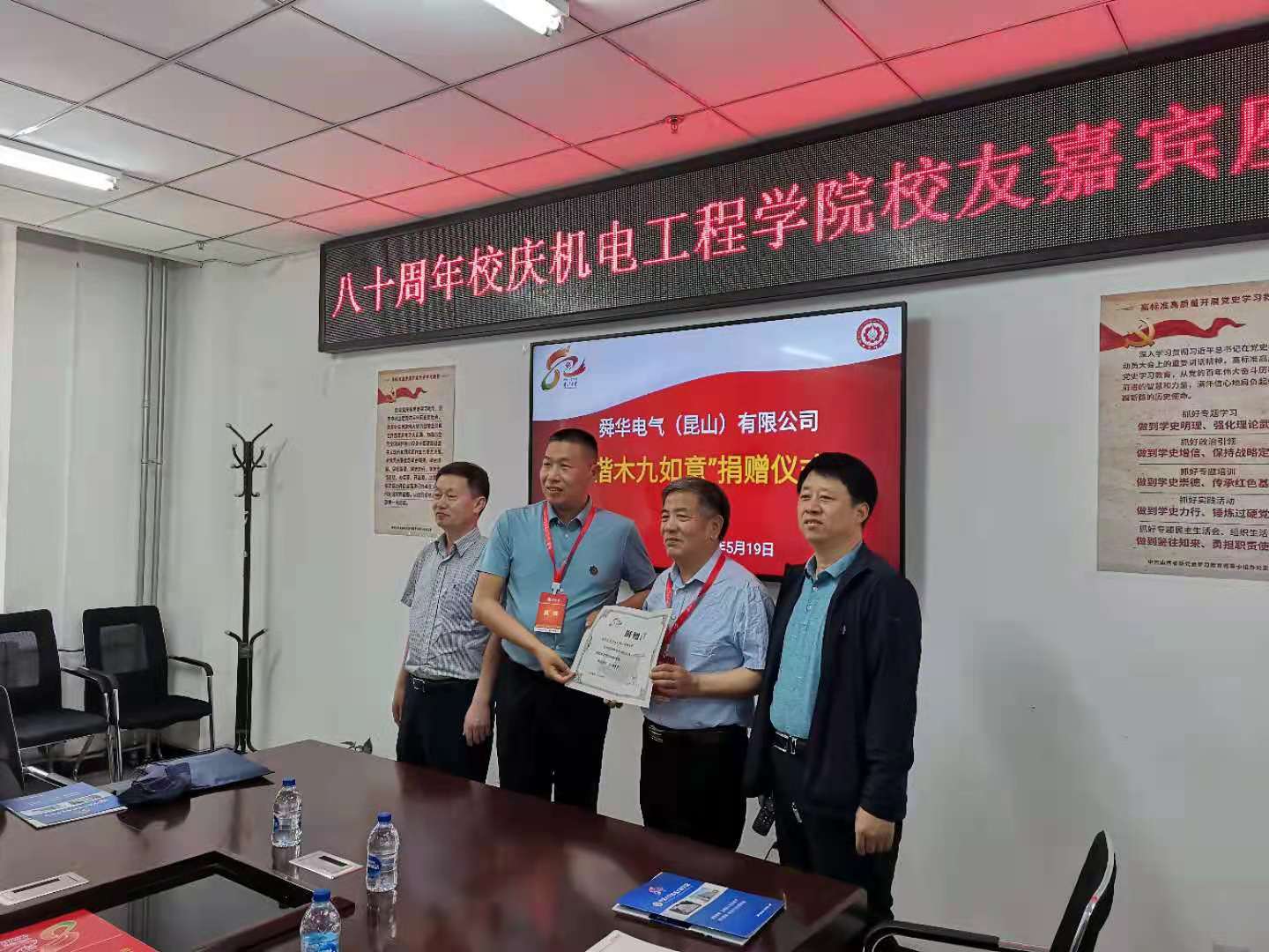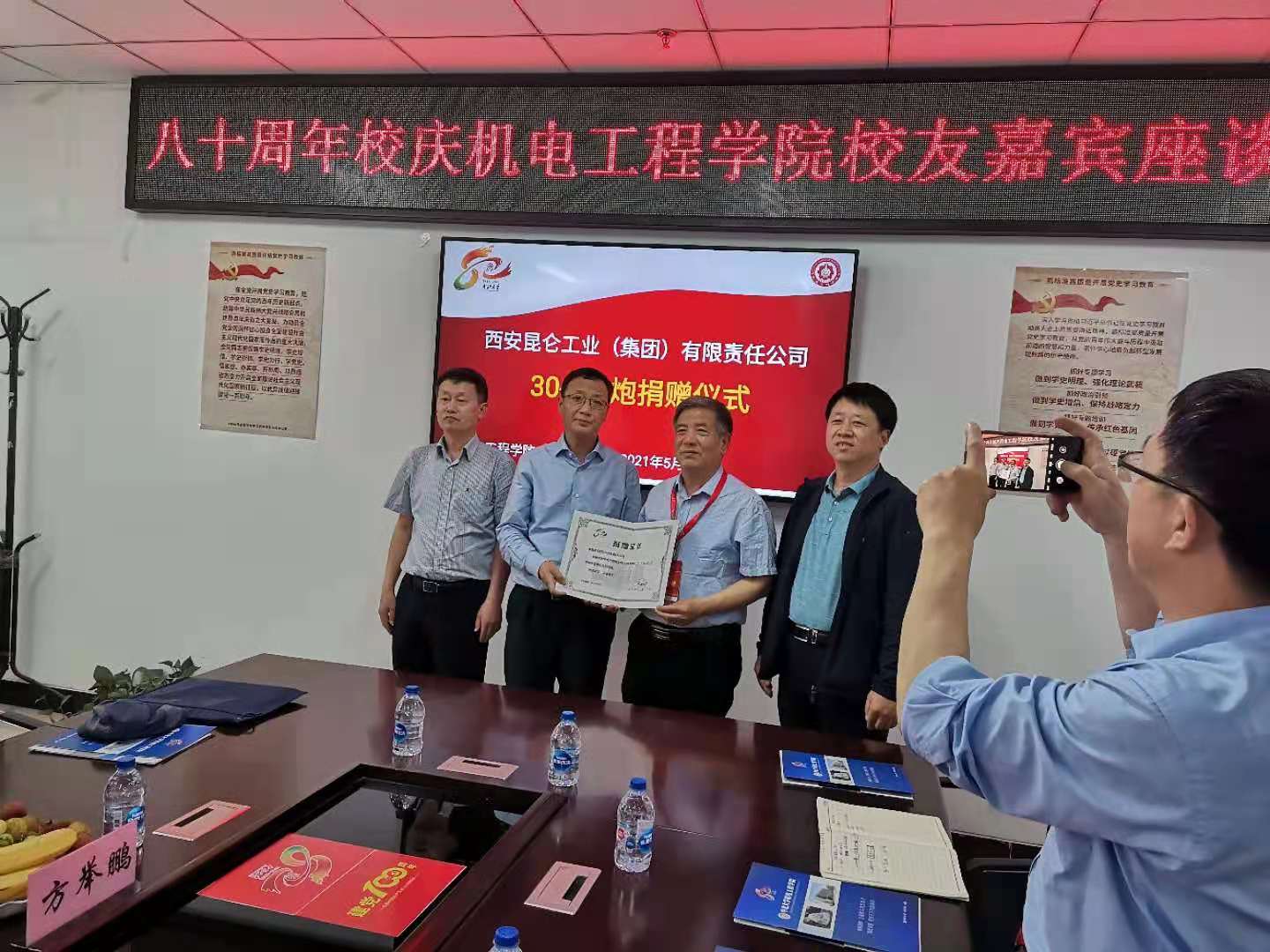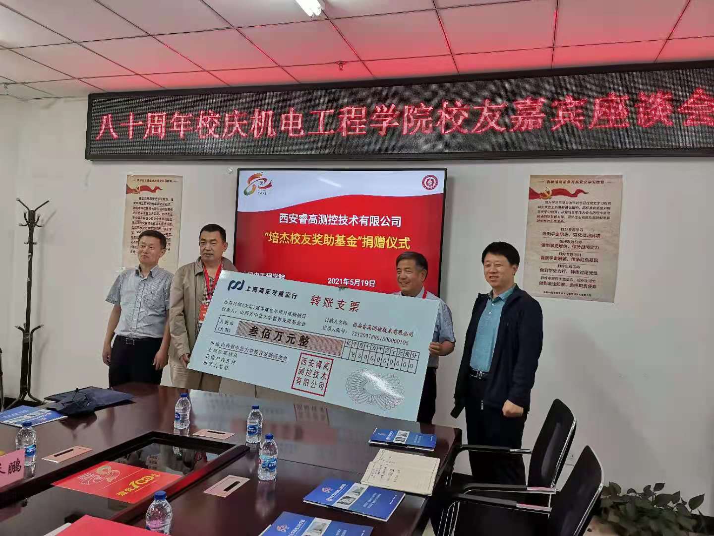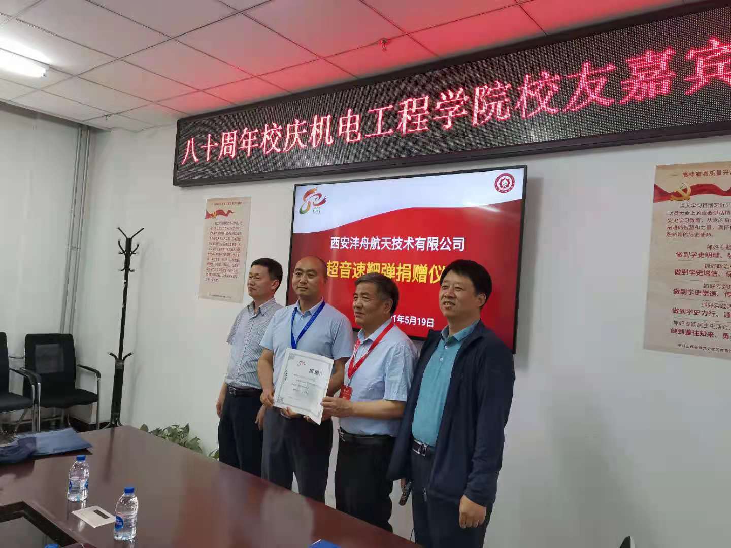5月19日下午2:30,企业捐赠仪式在科学楼A座学院313会议室举行。西安昆仑工业(集团)有限责任公司党委书记、董事长刘亚北、睿高测控技术有限公司董事长付培杰、舜华电气有限公司总经理陈士博、西安沣舟航天技术有限公司总经理方举鹏和69书吧