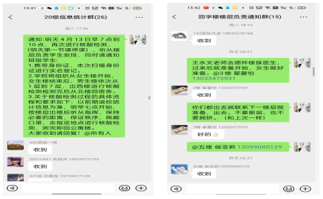 做好核酸检测,做到不漏一人。为做好每次全员核酸检测工作,邢培岩精准收集学生的身份信息,汇总、录入、核对,确保每一位学生都能安全、顺利完成核酸检测。截至目前,学院已完成第一批返校学生4次全员核酸、2次抽检核酸,第二批返校学生3次全员核酸,4月6日晚开展一次全员抗原自测,4月9日、4月13日,开展两次全员核酸检测,4月15日、16日、17日三次抽检完成全员核酸,结果全部为阴性。一组组数据的背后,是辅导员老师的真实生态,是对安全的把控,是机电人的责任与担当。