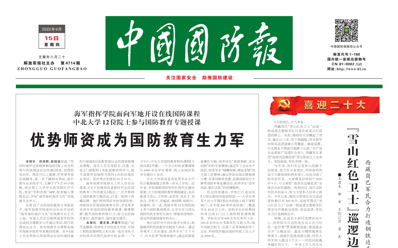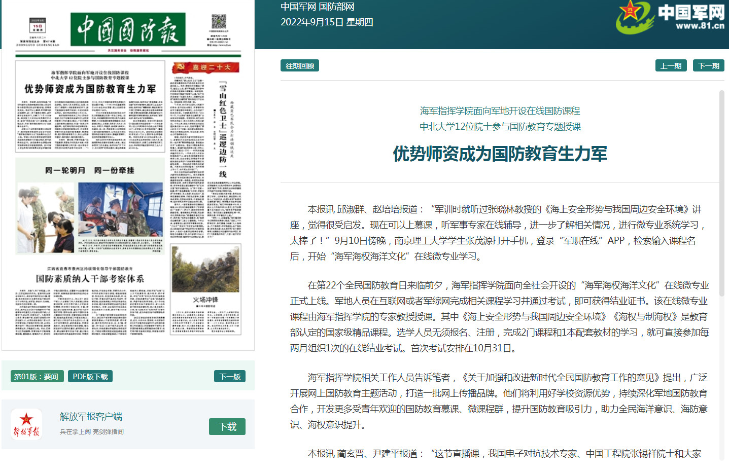 今天出版的《中国国防版》头版头条以“优势师资成为国防教育生力军---69书吧