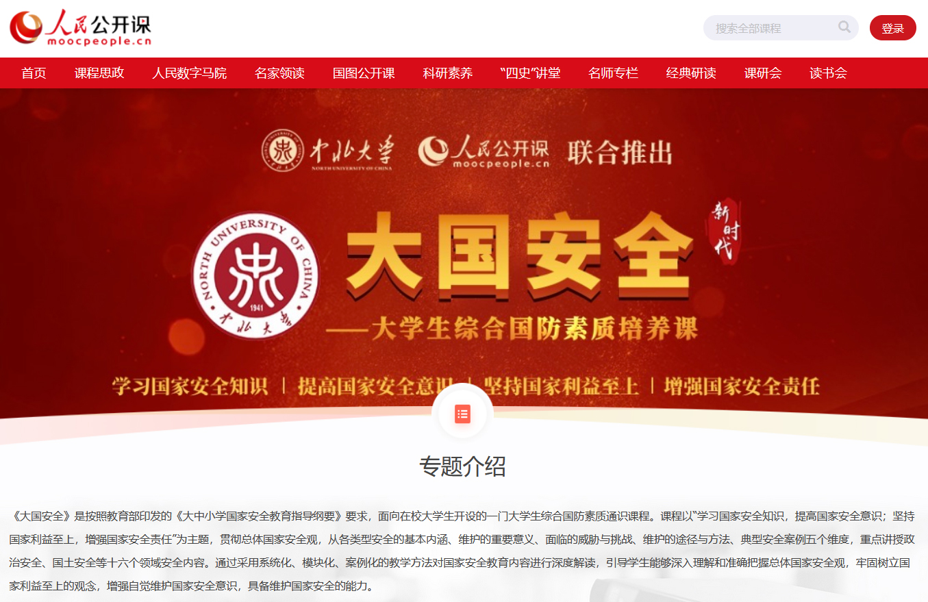 建设的又一门“课程思政”特色课--《大国安全》成功上线人民网-人民公开课。此前,该课程已先后上线智慧树、学堂在线、军职在线、学银在线、超星尔雅等多个教学资源平台,选课学校包括吉林大学、沈阳理工大学、延安大学、蚌埠学院等十多所院校,选课学生超过1万人,累计点击率超过200万,课程建设取得明显成效。