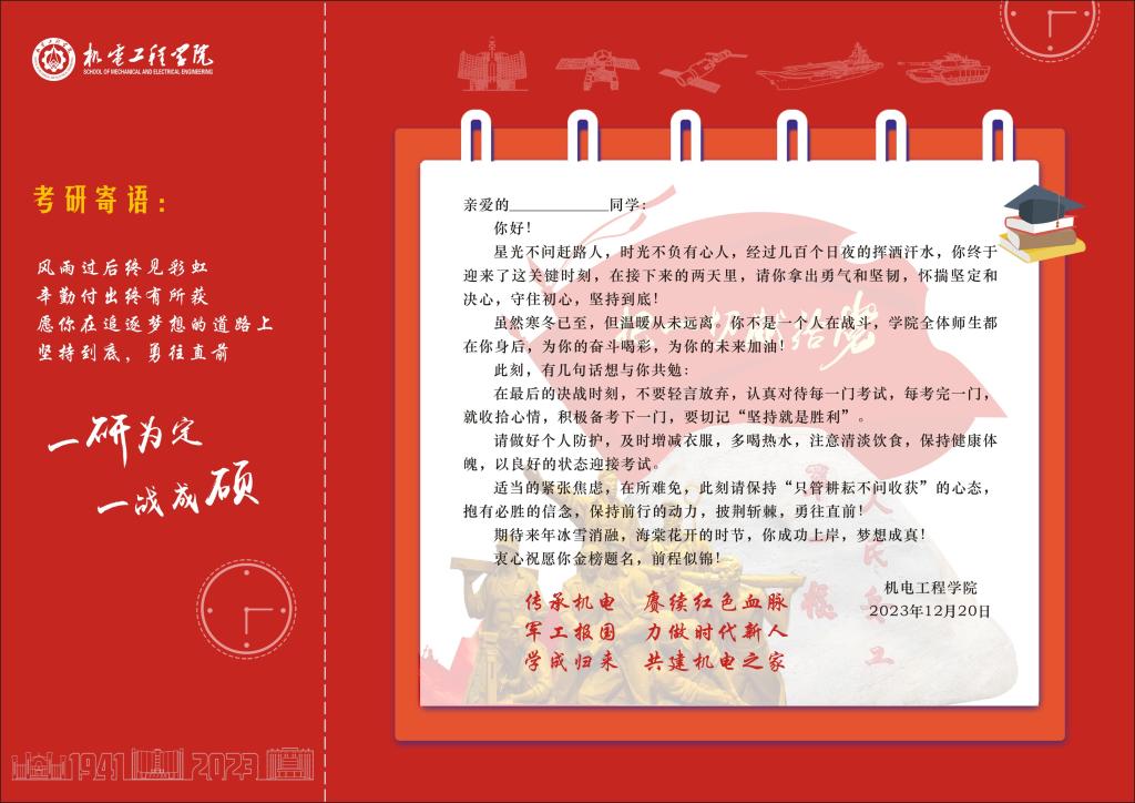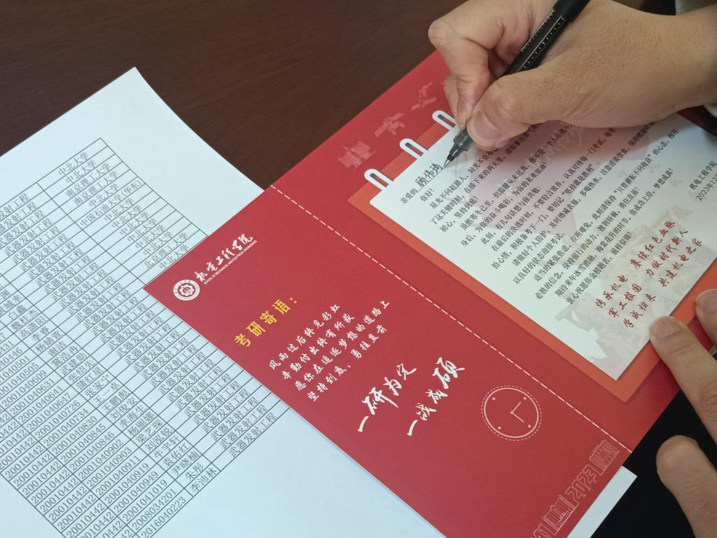 于2023年12月21日在文瀛17号宿舍楼为备战考研的同学们送去了意义非凡的祝福卡和考研文具包。祝福卡精心设计并由学院领导带领全体辅导员和毕业班班主任亲手签署,文具包包含中性笔、涂卡笔、橡皮、小刀、胶棒、尺子和档案袋等考试用具,充分表示了学院对考研学子的深度关怀和美好祝愿。