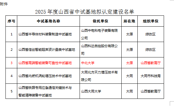 接山西省科技厅文件,根据《山西省科技计划项目管理办法》(晋政办发〔2021〕42号)、《山西省中试基地建设与运行管理办法(试行)》(晋政办发〔2022〕42号)有关规定,山西省高端智能装备可靠性中试基地申报成功山西省中试基地。
