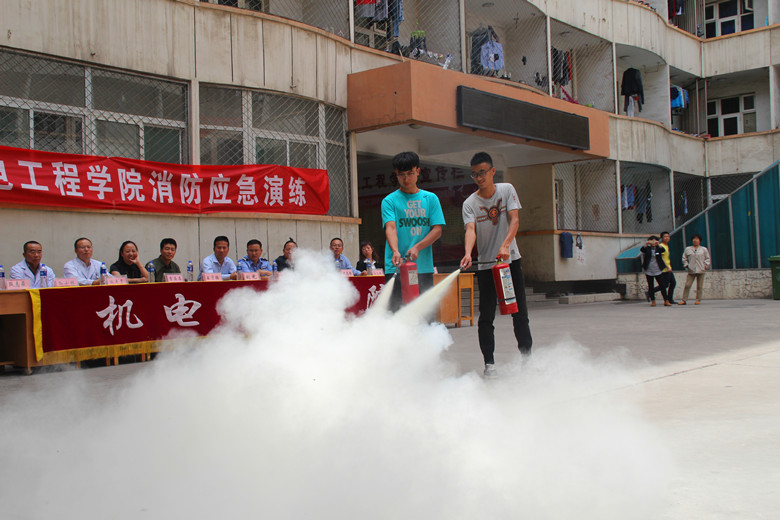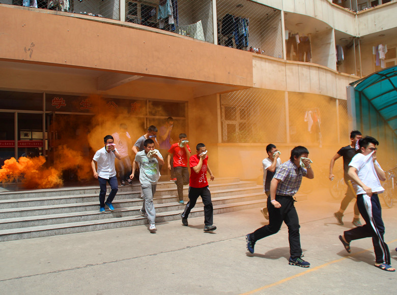 下午1点20分,演习正式开始。只见各个寝室楼的出口处浓烟滚滚,哨声响器,同学们有条不紊的用湿毛巾或手帕捂住口鼻俯身从寝室楼中撤离出来。很快,楼内所有同学们都撤离了寝室,来到楼下天井内集合。保卫处的老师向同学们讲解了灭火器的使用方法并请学生代表动手操作实践。同学们认真听讲,积极参与,掌握求生技巧。随后,吴耀金处长对此次消防演练做指示并讲话,他表示,消防要做好,预防是关键。无论在什么地方,都不要做存在安全隐患的事情,自己才是保护生命安全的关键。校医院田平贵大夫进行急救知识讲解及演示。最后,刘光书记对此次演练做了总结,他强调,安全是第一,掌握灭火知识。是大学生必不可少的求生技能,同学们要认真了解消防知识,保障自身人身、财产安全。