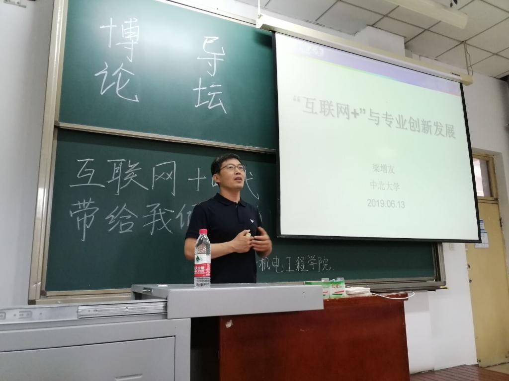 博士生导师,美国密苏里大学访问学者,中国兵工学会会员,是我校兵器领域的知名专家和学术带头人。本次论坛在热烈的气氛中开始。学生科贺婧老师首先提到,梁教授是我们学校宝贵的人才财富,“大学之大,在于大师”,梁教授的学术造诣颇高,希望同学们可以通过此次论坛了解互联网+的含义。之后,梁教授就互联网+展开了本次论坛。他先深入简出的讲述了互联网+的含义,又深刻的讲述了互联网+时代包含的六大特征,其中包括跨界融合,创新驱动。重塑结构,尊重人性,开放生态,连接一切等。在讲解中,梁教授引入《三体》的故事、5G时代的开启,增加了讲解的趣味性。讲坛气氛热烈而友好。面对互联网+专业创新的话题,梁教授说:“在互联网+时代的现在,科技发展不断向前,我们不能闭门造车,要集思广益,去了解更多与自身专业相联系的东西。”他要求我们青年人不仅要有坚实的专业基础知识,还要有脑洞大开的视界。他借用刘慈欣的《流浪地球》阐述了互联网+的时代内涵。最后,梁教授表示,一代人有一代人的长征,一代人有一代人的担当。建成社会主义现代化强国,实现中华民族的伟大复兴的中国梦是一场接力跑。希望年轻的机电人在这个接力跑中能够奋发有为,勇于创新,实现自己的人生价值,为建设伟大的国防贡献自己的力量!讲坛在热烈的讨论中结束。