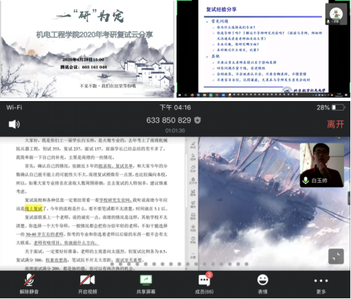 通过腾讯会议平台举办了以一“研”为定为主题的2020年考研复试云分享会,此次分享会由学院负责就业的段老师主持,邀请到了2019年参加研究生复试的四名学长主讲,并有60多名在校生聆听了这次分享会。