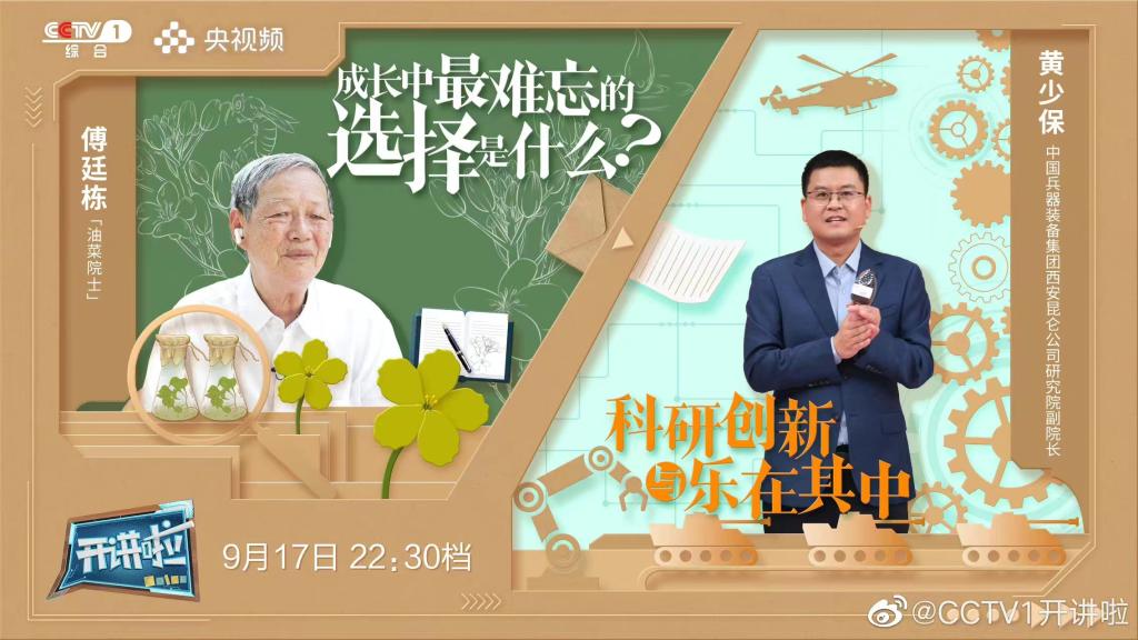 03011401班武器系统与发射工程专业毕业生、中国兵器装备集团西安昆仑工业(集团)有限责任公司研究院副院长黄少保作为嘉宾走进央视《开讲啦》节目,分享自己的逐梦之路,和青年共同探讨科研的价值与意义。