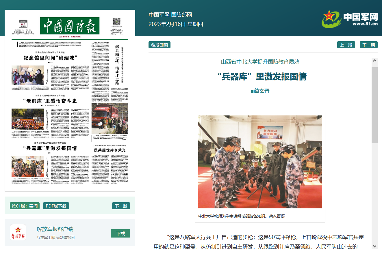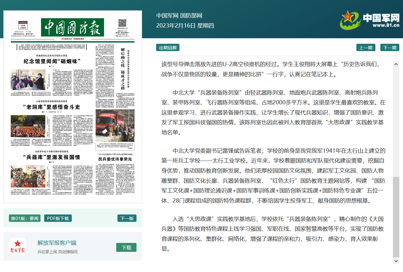 党委副书记雷锋斌告诉笔者,学校的前身是我党我军1941年在太行山上建立的第一所兵工学校——太行工业学校。近年来,学校着眼国防和军队现代化建设需要,挖掘自身优势,推动国防教育创新发展。他们浓厚校园国防文化氛围,建起军工文化园、国防人物雕塑群、国防文化长廊、兵器装备陈列室、“红色太行”国防教育主题网站等,构建“国防军工文化课+国防理论通识课+国防军事训练课+国防创新实践课+国防特色专业课”五位一体、28门课程组成的国防特色课程群,不断培固学生投身军工、献身国防的思想根基。