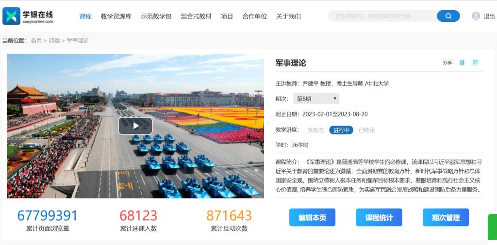 《军事理论》课程,经过多年持续不断的建设,已经建成涵盖138个知识点的线上教学内容,并建设了课程素材库,上线超星学银在线、智慧树、学堂在线、学银在线、智慧高教等多个在线教育平台,选课学校超过500所。截止目前,超星学银在线平台选课学校240余所校(包括成都大学、内蒙古工业大学、河南科技大学、太原科技大学、江西师范大学、陕西师范大学、沈阳理工大学、重庆工商大学、重庆交通大学、遵义医科大学、四川美术学院、长治医学院、广西医科大学、华北理工大学、上海电机学院、延安大学、山西农业大学、河北工程大学、安徽大学、中国人民解放军空军航空大学、山东科技大学、福州大学、焦作大学等),选课学生6.8万人,累计浏览量6779.9391万,累计互动次数87.1643万次。智慧树在线平台选课学校262所高校(包括南开大学、天津大学、北京邮电大学、哈尔滨工程大学、中山大学、中南大学、东南大学、西北工业大学、河南大学、合肥工业大学、东北农业大学、北京体育大学、天津工业大学、石河子大学、北方工业大学、苏州大学、东北石油大学、中国民航大学、内蒙古大学、华东理工大学、太原理工大学、海南师范大学、昆明医科大学、河南警察学院、广西警察学院、云南警官学院等),选课学生1.1万人。《军事理论》课程先后获山西省本科一流课程、“智慧树杯”全国高校“课程思政”教学设计大赛特等奖和教育部在线教育研究中心“2022拓金计划”示范课程,取得了显著的课程建设成效。