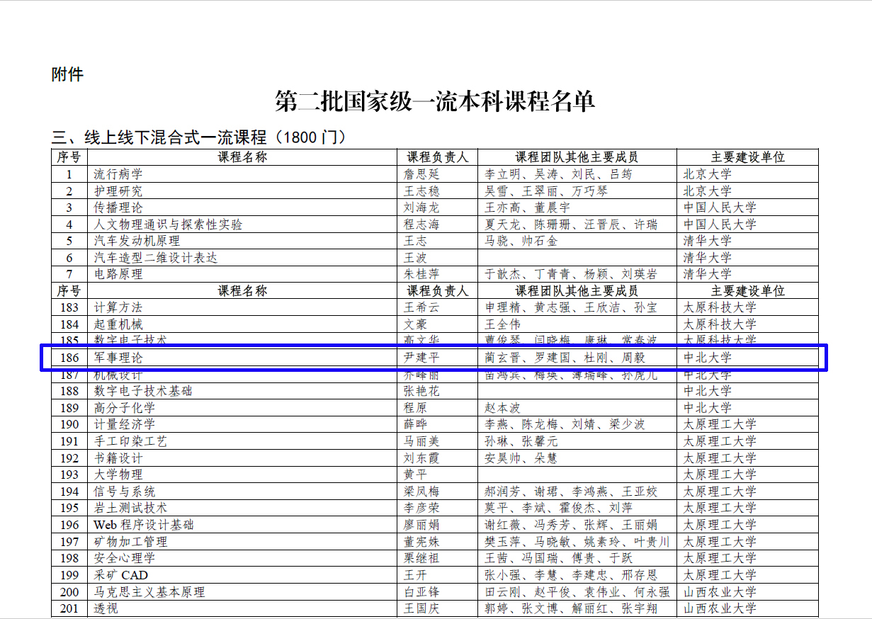 尹建平教授牵头申报的《军事理论》,被认定为线上线下混合式国家级一流本科课程。