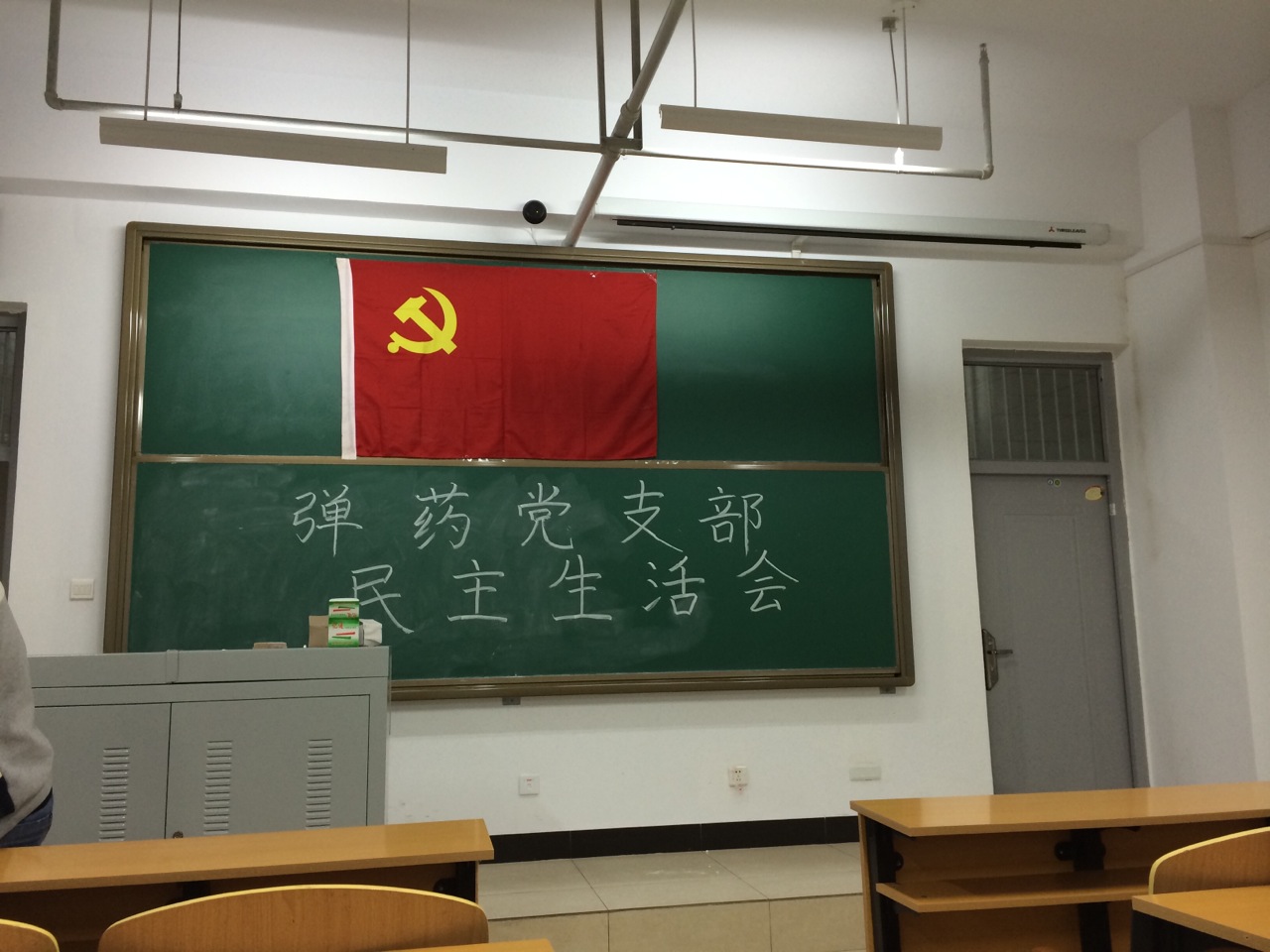 弹药工程与爆炸技术专业学生党支部于15107H召开了2015年弹药党支部第一次民主生活会。弹药支部所有党员、预备党员参加了此次会议。本次会议由支部书记刘帅同志主持,主要内容是对本学期支部活动及选拔培养对象的相关事宜进行部署。