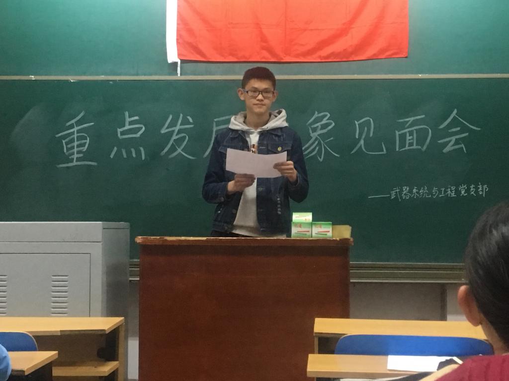 首先,学生第三党支部副书记王小龙同志上台介绍会议目的,并为7名重点发展对象分配了培养联系人及入党介绍人。7名重点发展对象依次上台发言,向大家进行自我介绍并讲述自己对党的认识、做出的一些贡献以及一些学习、思想和生活方面的感悟。