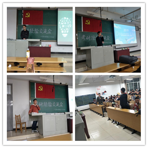交流会上,考入中南大学的庙志超同志从校园风景、考研心态、生活日常作息等方面向大家分享了自己的考研经验,他希望大家在准备考研的过程中注重心态的调节,只有心态好才能效率高。考入南京航空航天大学的赵子祯同学向大家分享了南京航空航天大学初试、复试的主要内容及注意事项,和考研过程中可能遇到的困难及克服办法。考入西北工业大学的赵雷同学针对于有意向报考西北工业大学的同学分享了自己考研期间的时间分配以及各阶段安排,他告诫大家无需追求长时间学习,而是要找到适合自己的作息规律,高效学习。
