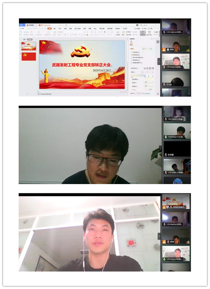 武器发射工程专业党支部依托腾讯会议顺利召开了线上支部预备党员转正大会。本次大会由支部副书记杨雪同志主持,支部书记段雪倩老师及支部全体党员、预备党员参加。