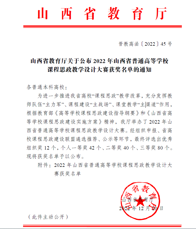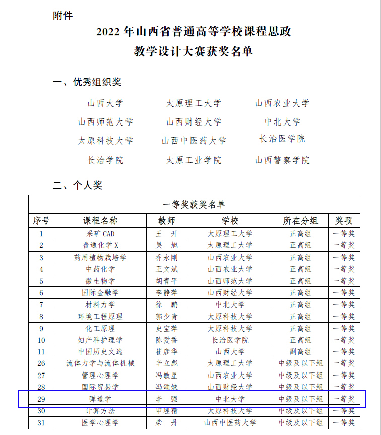 为进一步推进我省高校“课程思政”教学改革,充分发挥教师队伍“主力军”、课程建设“主战场”、课堂教学“主渠道”作用,引导广大教师进一步挖掘思政元素、共享经典案例、交流教学技能、提升教学能力,2022年11月15日,由山西省教育厅主办,山西省高校课程思政建设联盟承办的“山西省普通高等学校课程思政教学设计大赛决赛”在我校举行。通过前期初赛、复赛的层层选拔和淘汰,全省31所高校162名教师参加了决赛。经过激烈角逐,评出一等奖42个,二等奖40个,三等奖80个,优秀组织奖12个。69书吧