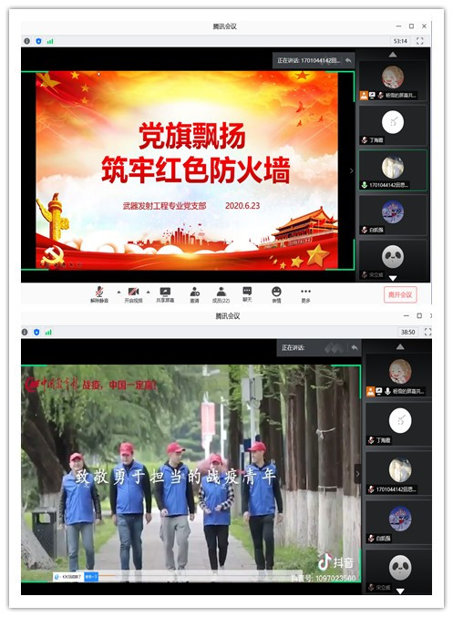 为贯彻落实教育部“四个一”行动的要求,充分发挥学院基层党组织战斗堡垒作用和师生党员先锋模范作用,2020年6月23日晚七点,武器发射工程专业党支部借助腾讯会议软件成功举办“党旗飘扬,筑牢红色防火墙”的战疫专题微党课。此次活动由支部副书记杨雪同志主持,支部全体正式党员、预备党员参加。