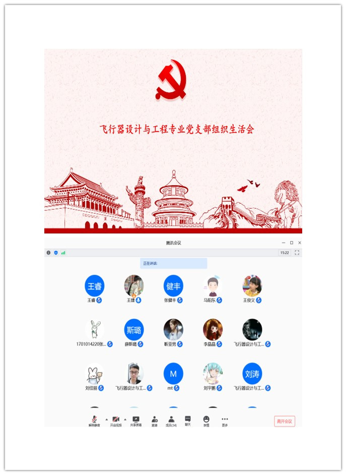 飞行器设计与工程专业党支部于2020年6月20日4点在腾讯会议APP上召开以“迎党的生日、讲战疫故事、悟初心使命”为主要内容召开组织生活会。由支部内的五名同志为大家分享他们在疫情期间的生活及感想。